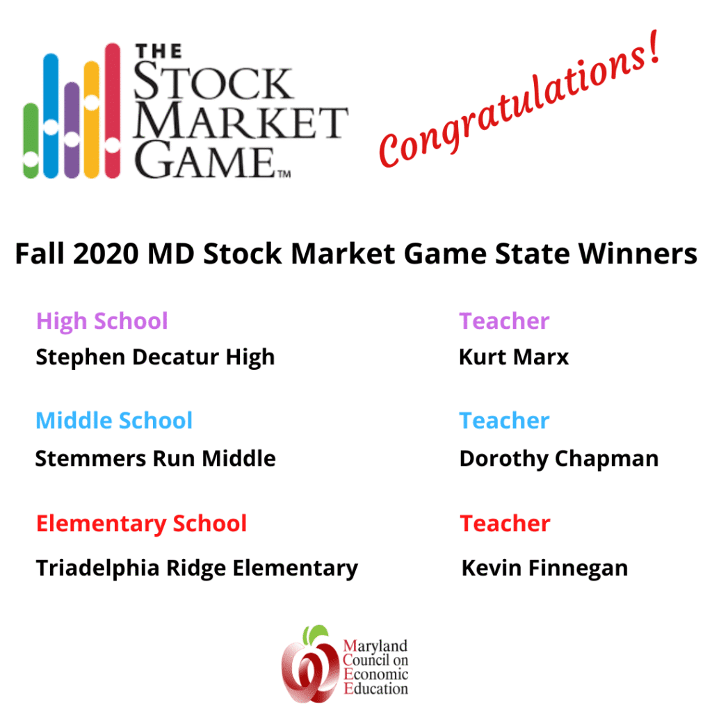We are pleased to announce the winners of the fall session of the Stock Market Game™ experience. The Maryland Council on Economic Education (MCEE) offers the Stock Market Game™ to students and teachers throughout Maryland in grades 4-12 as a transformational, hands-on learning activity.