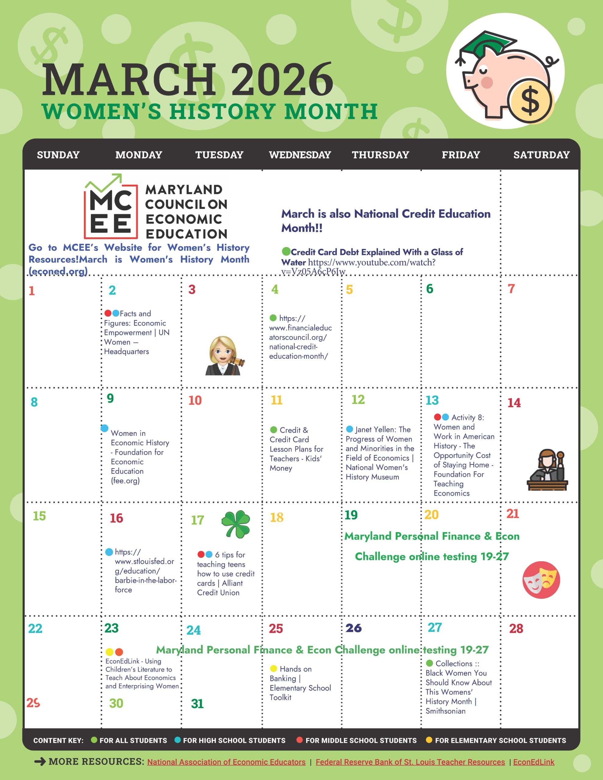 In alignment with our mission to empower individuals with essential financial literacy, MCEE is pleased to offer educators a dynamic calendar of activities and resources for Financial Education Month.